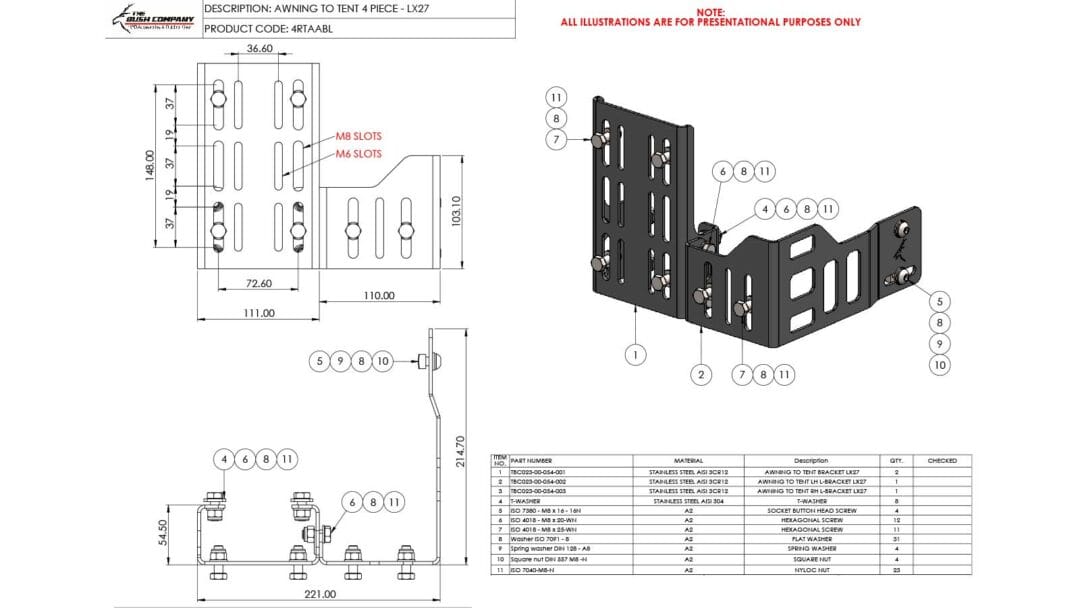 The Awning To Tent Bracket 4 Piece is designed to be easily mounted to The Bush Company’s LX27 Clamshell Rooftop Tent by using the ‘Ezi Slot’ channels in the base frame of the tent.