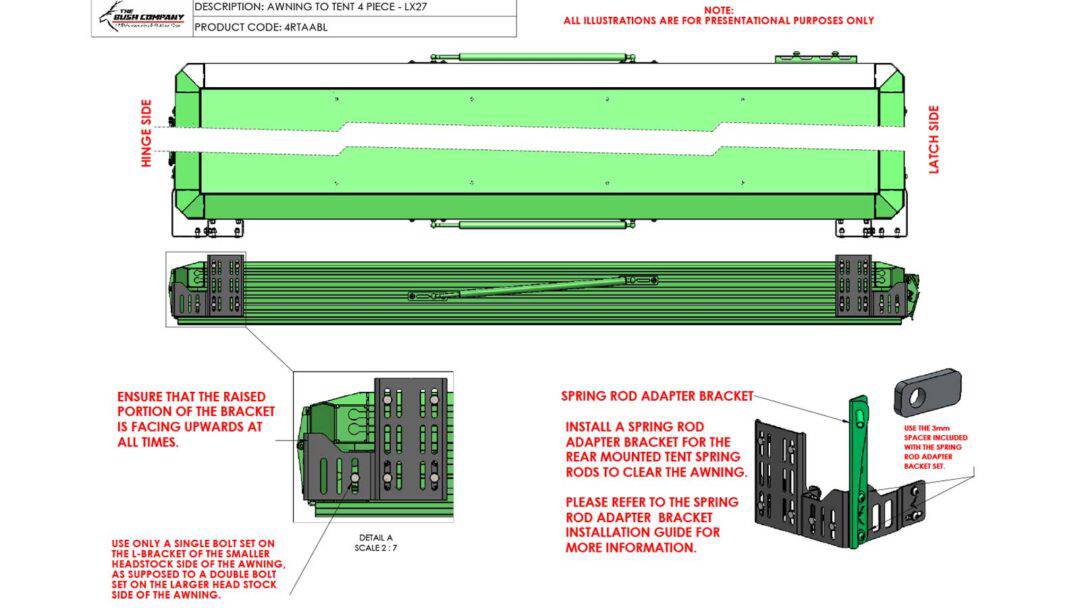NOTE: if you need to mount the awning bracket pointing upwards due to your vehicle configuration, we recommend selecting the Spring Road Adapter with the awning bracket. The Spring Rod Adapter eliminates the need to bend a ‘dog leg’ in the spring steel pole of your tent to clear the awning when deployed. The Awning To Tent Bracket 4 Piece is only suitable for the LX27 rooftop tent.