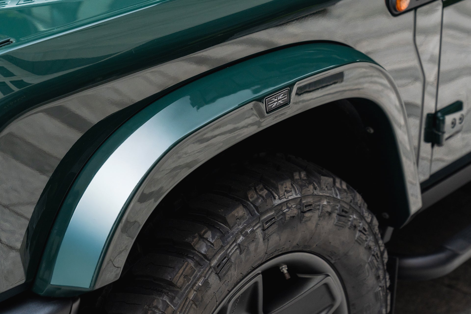 To complete the transformation, KAHN® Union Flag badges, meticulously crafted from zinc alloy and finished in polished chrome and satin black, are seamlessly integrated into custom recesses on each arch, Cowl, and Rear Roof Wing adding a subtle yet distinguished accent.