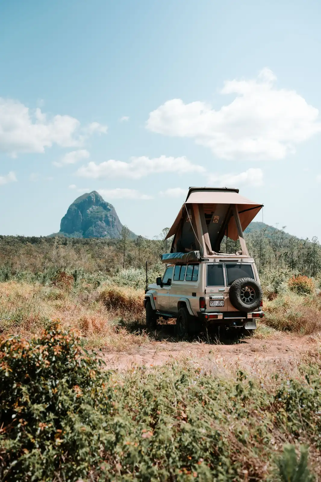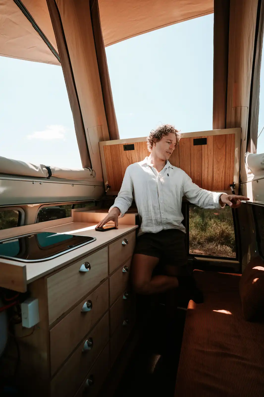 Comfort-focused roof cabin interior for the LC 75/78 Troop Carrier, featuring light grey carpet roof lining, lightweight hardwood ceiling panels, and a 90 mm memory-foam mattress (1250 mm × 2400 mm). Dual ceiling fans, red/white LED lighting in the cabin and roof, and a canvas organiser with USB-A and USB-C charging ports keep the space comfortable and practical. Wrap-around awnings protect the windows from rain and sun, while full-length roof rails, dual 50-amp Anderson solar/AUX inputs, and a heavy-duty tow-bar mounted steel step add extra capability for extended off-road travel.
